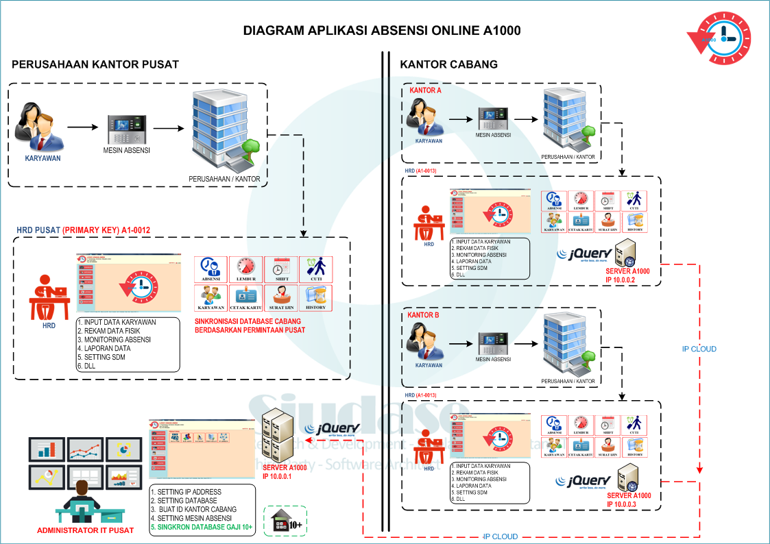 Khusus untuk Absensi A1000 Web Cloud ini merupakan versi pilihan yang diinginkan, dengan menggunakan private ip cloud pada internal internet jaringan tunnel dengan konsep 3 tier.menjadikan seluruh data absensi terintegrasi.Untuk prinsip dan cara kerja aplikasi ini sama dengan versi desktop core.