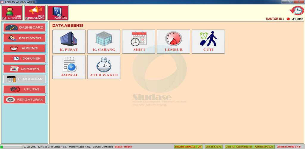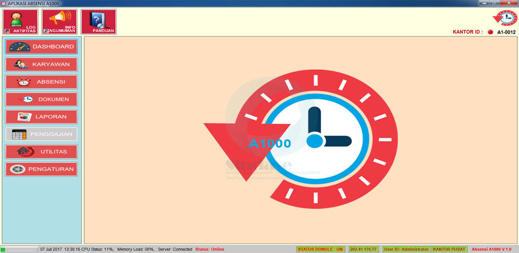 Aplikasi A1000 merupakan aplikasi absensi berbasiskan jaringan klien server yang memiliki 3 tipe jenis absensi diantaranya berbasiskan standalone offline dan online, aplikasi ini telah terintegrasi dengan sistem penggajian aplikasi Gaji 10+, sehingga hasil informasi akan data karyawan sangat lengkap.