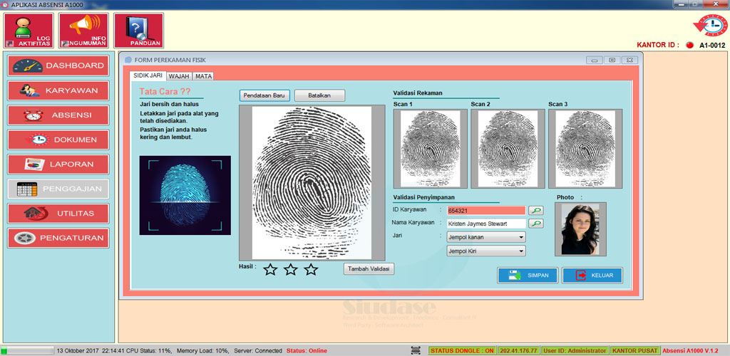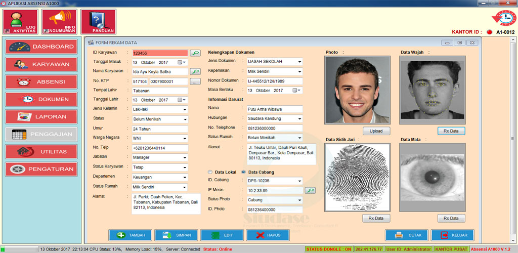 Aplikasi Absensi A-1000, merupakan aplikasi absensi yang terintegrasi dengan mesin absensi yang menggunakan sidik jari atau finger print, perekaman menggunakan wajah dan kartu akses. Dengan adanya kebutuhan akan absensi karyawan, kami hadirkan sistem absensi A1000 yang terintegrasi dengan mesin absensi yang menggunakan sidik jari atau finger print, perekaman menggunakan wajah dan kartu akses. Aplikasi Absensi A1000 berusaha memperbaharui dengan kondisi modul versi yang tersedia saat ini. Untuk batasan pada database absensi A1000 tidak kami batasi, mengingat data absensi merupakan kunci utama pada penentuan dalam penggajian.