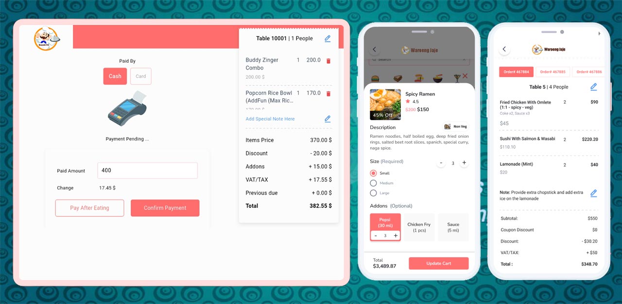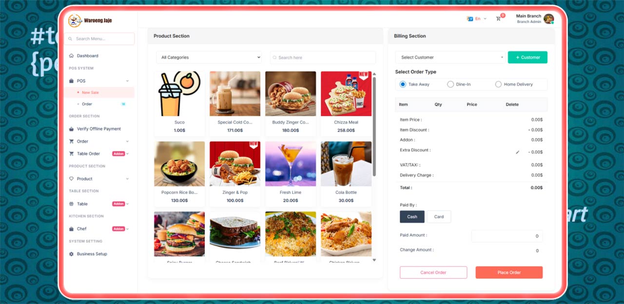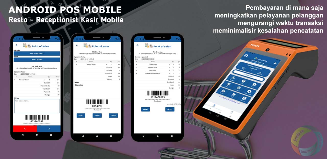 Aplikasi Waroeng Jaje juga dilengkapi dengan POS Waroeng Jaje front Office Kasir, dengan sistem aplikasi pada panel layar sentuh dan terintegrasi dengan mesin Point Of Sale, menjadikan aplikasi semakin lengkap. Tidak lengkap rasanya jika tidak menggunakan aplikasi online dan aplikasi POS Waroeng Jaje. Aplikasi Waroeng Jaje disiapkan juga untuk versi online pada smartphone dimana restaurant atau restoran waroeng yang memiliki gerai masakan siap saji atau cabang cabang diluar kota atau daerah.